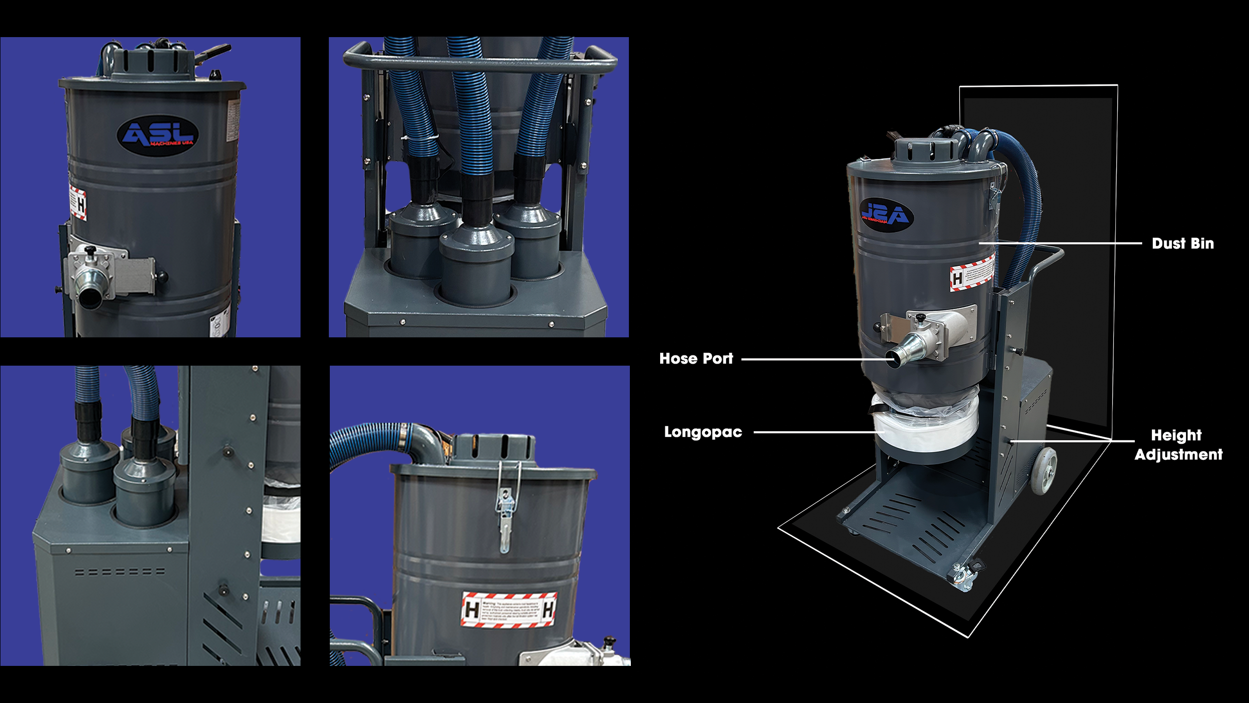 The vacuums are mainly equipped with a continus folding bagging system (Longo-Pac) for effective dust storage or a regular plastic bag system depending on the model.